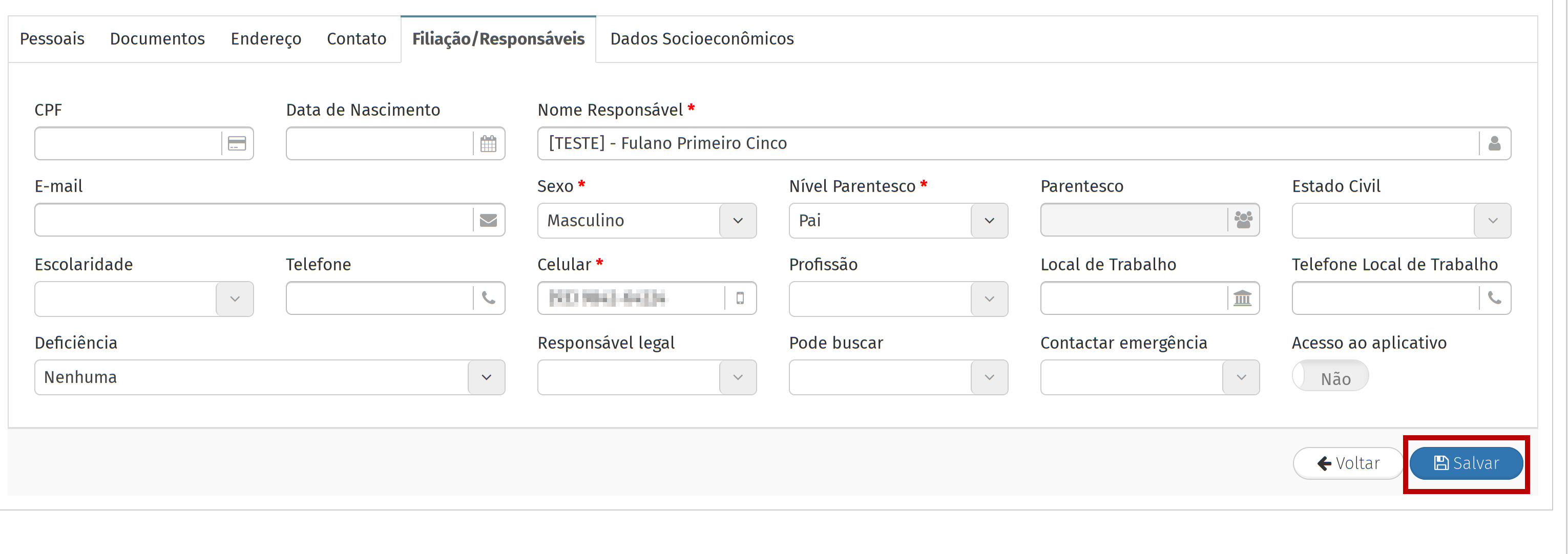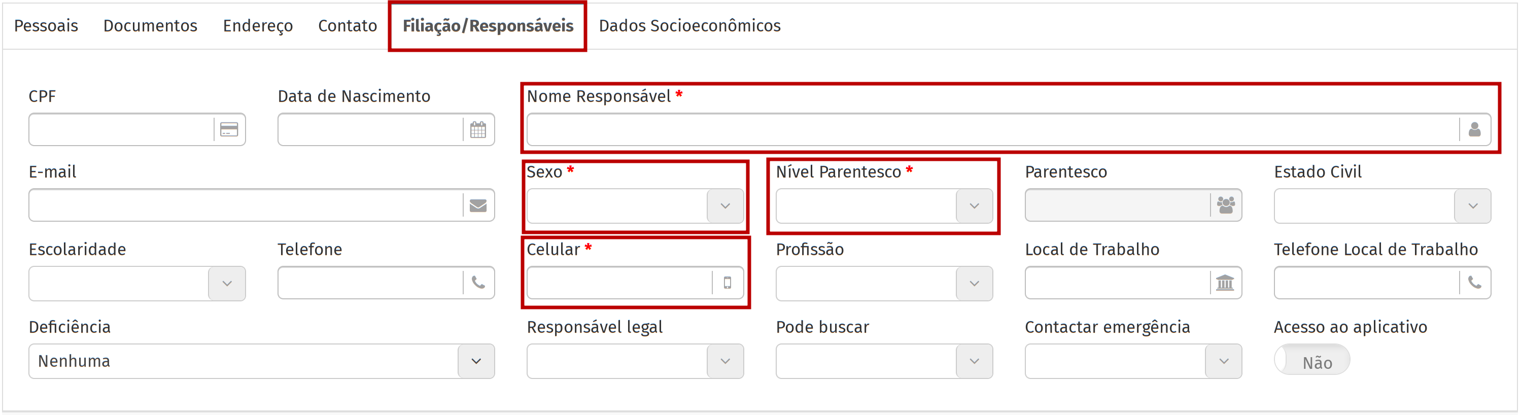 Na aba "Filiação/Responsáveis", preencha os campos obrigatórios, referentes aos dados de algum responsável legal do estudante.