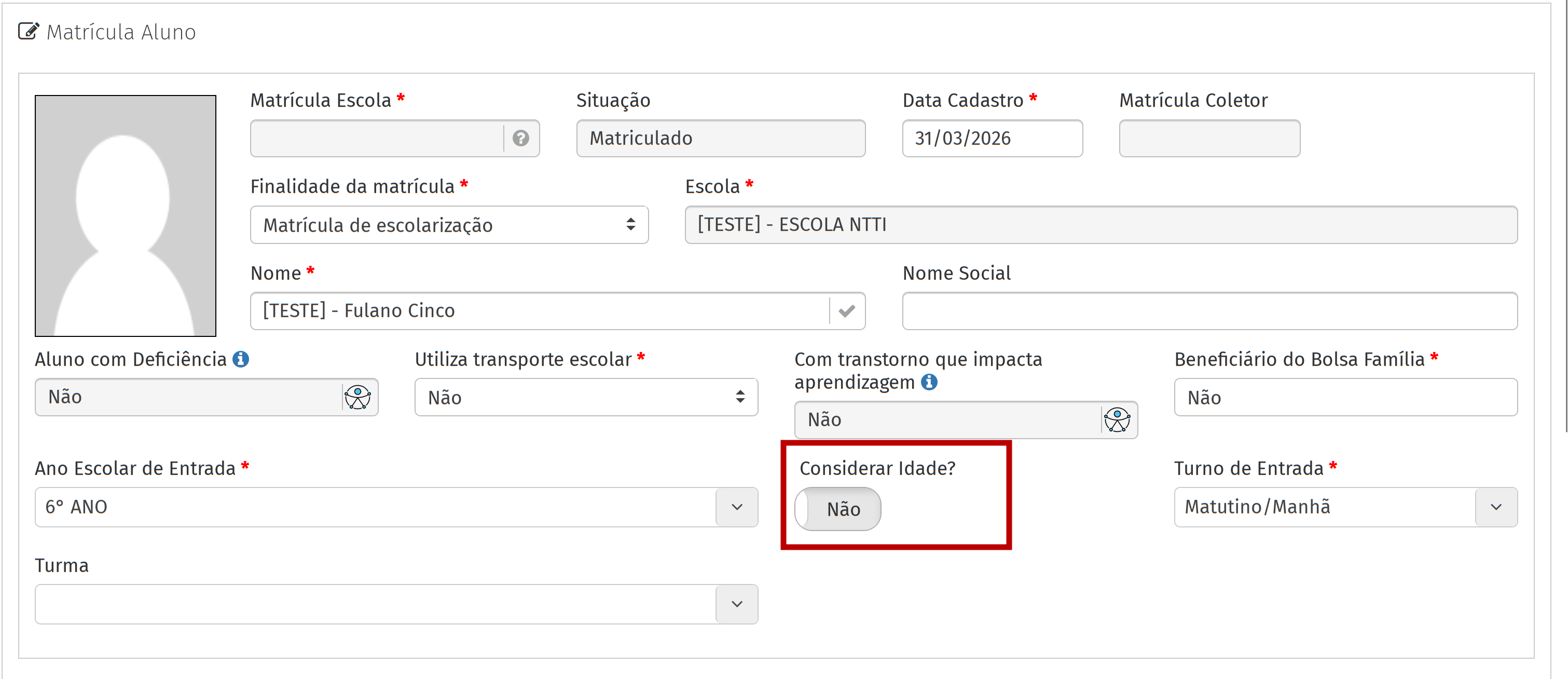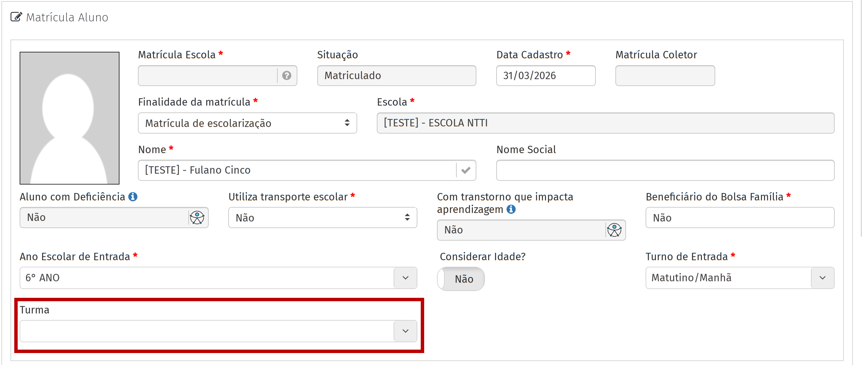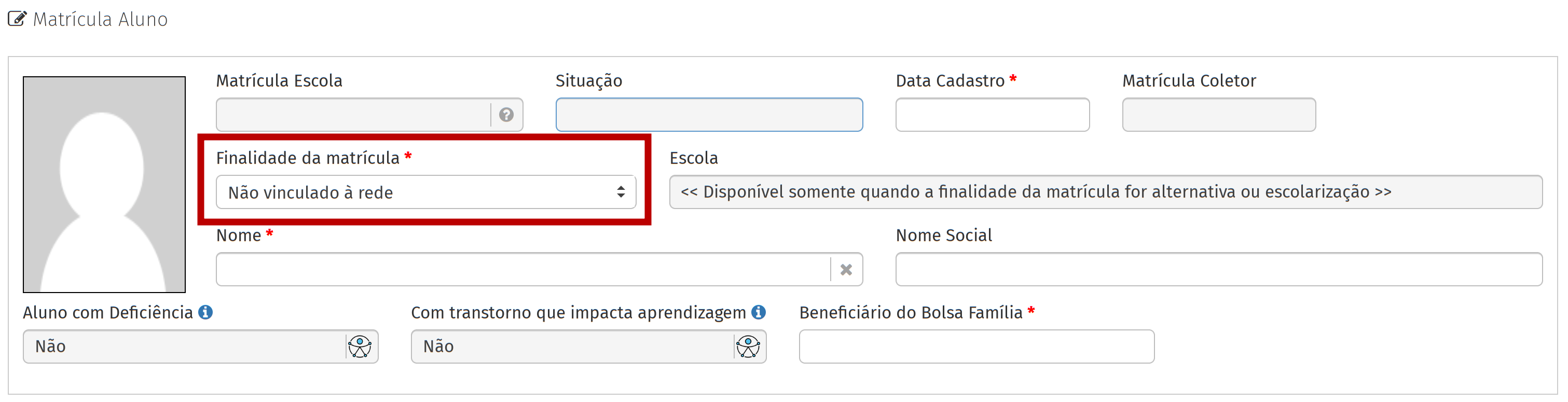 - Defina o campo Finalidade da matrícula como Não vinculado à rede.