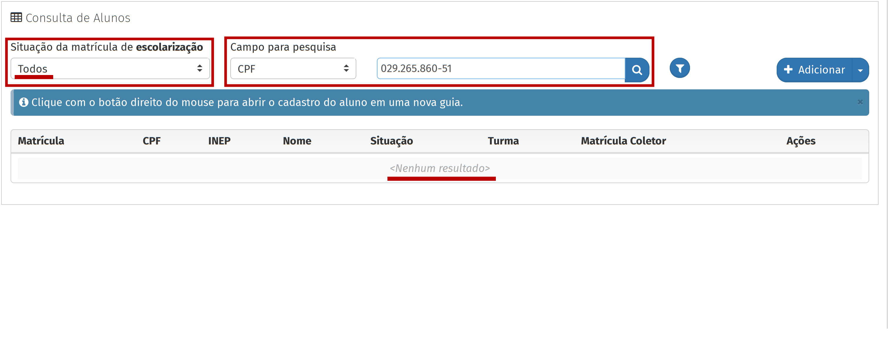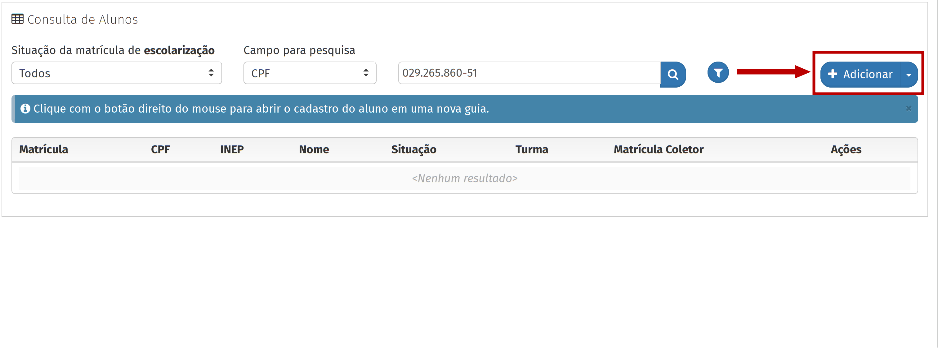 Primeiramente, defina o campo "Situação da matrícula de escolarização" como "Todos", e pesquise pelo estudante usando o CPF. Se a lista emitir a mensagem "Nenhum resultado", você deverá cadastrar o estudante.