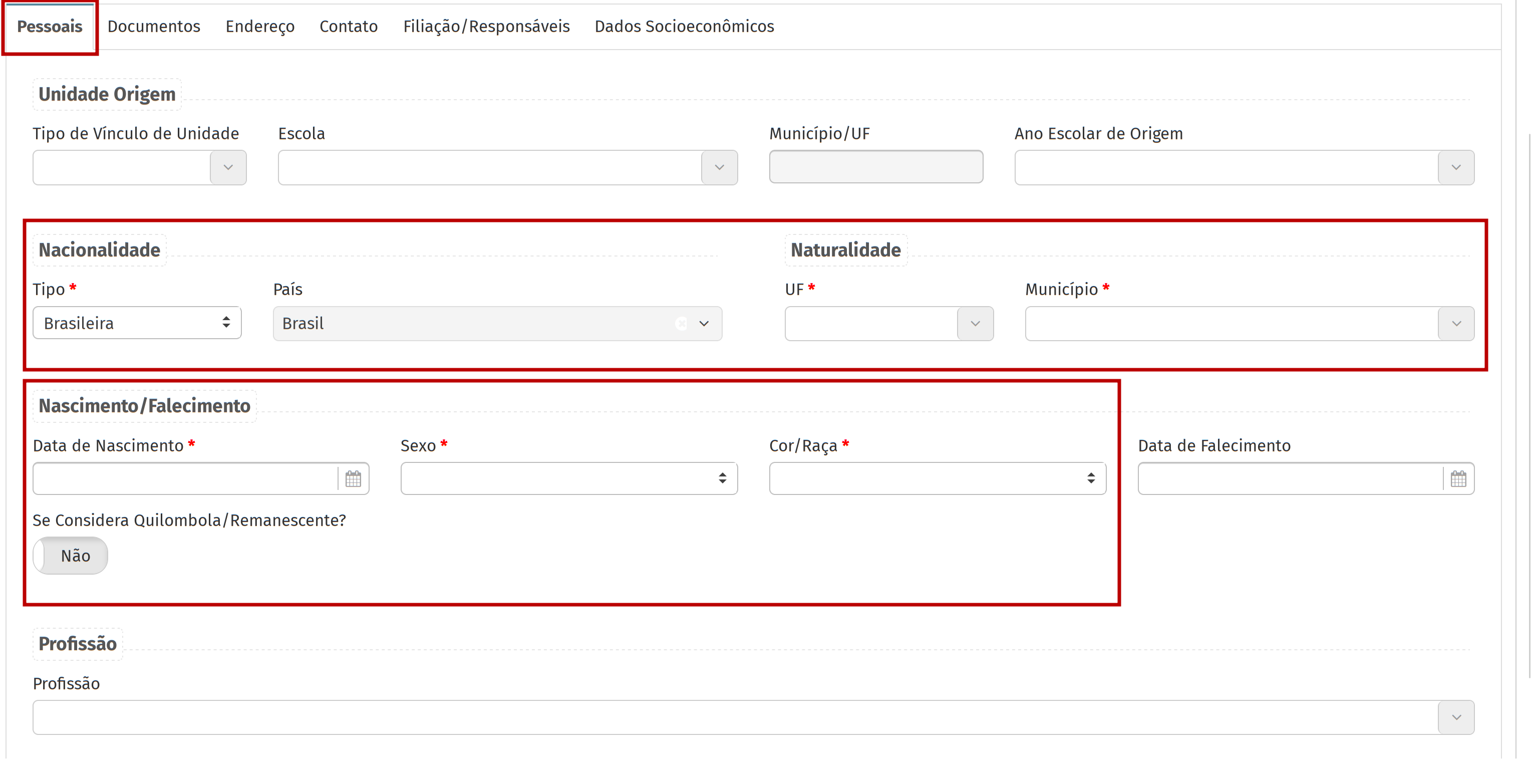 - Campos referente à nacionalidade. - Campos referentes à naturalidade. - Data de nascimento. - Sexo. - Cor/Raça.