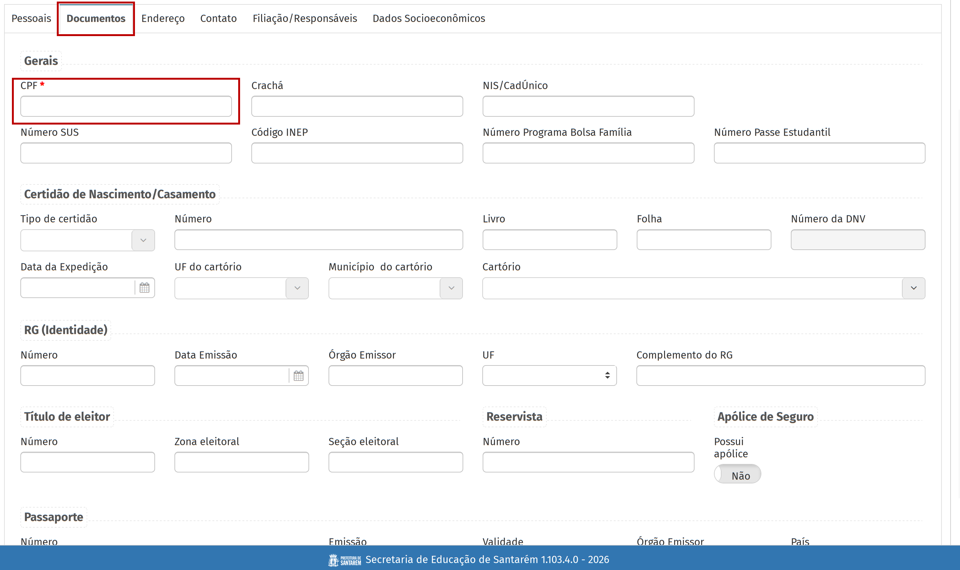 Na aba "Documentos", preencha os campos referentes aos documentos do estudante, especialmente o campo referente ao CPF, que é obrigatório. Se o estudante não possuir CPF, comunique o caso à assessoria de ensino da rede, e, mediante autorização, o NTTI outorgará o cadastro do estudante sem oo CPF.