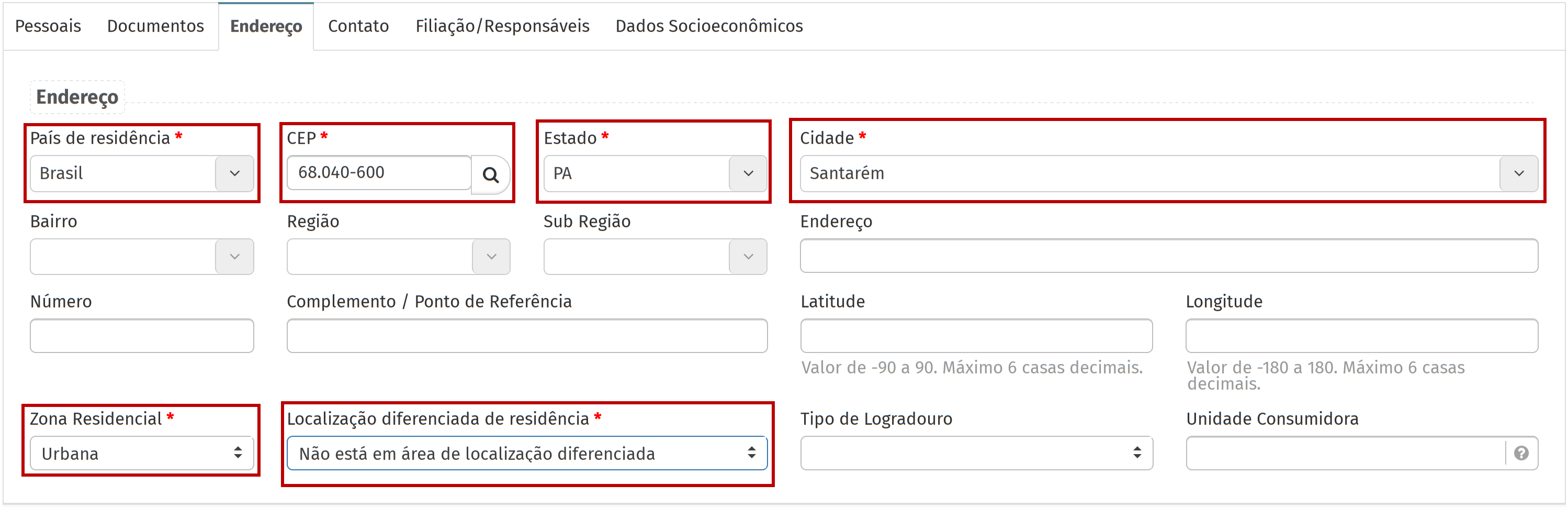 Na aba "Endereço", preencha os campos obrigatórios, referentes ao endereço de residência do estudante.