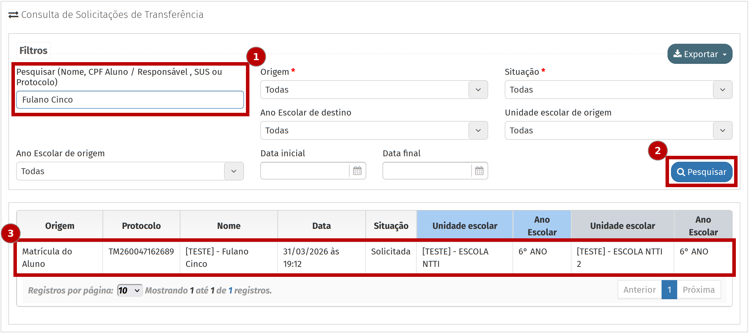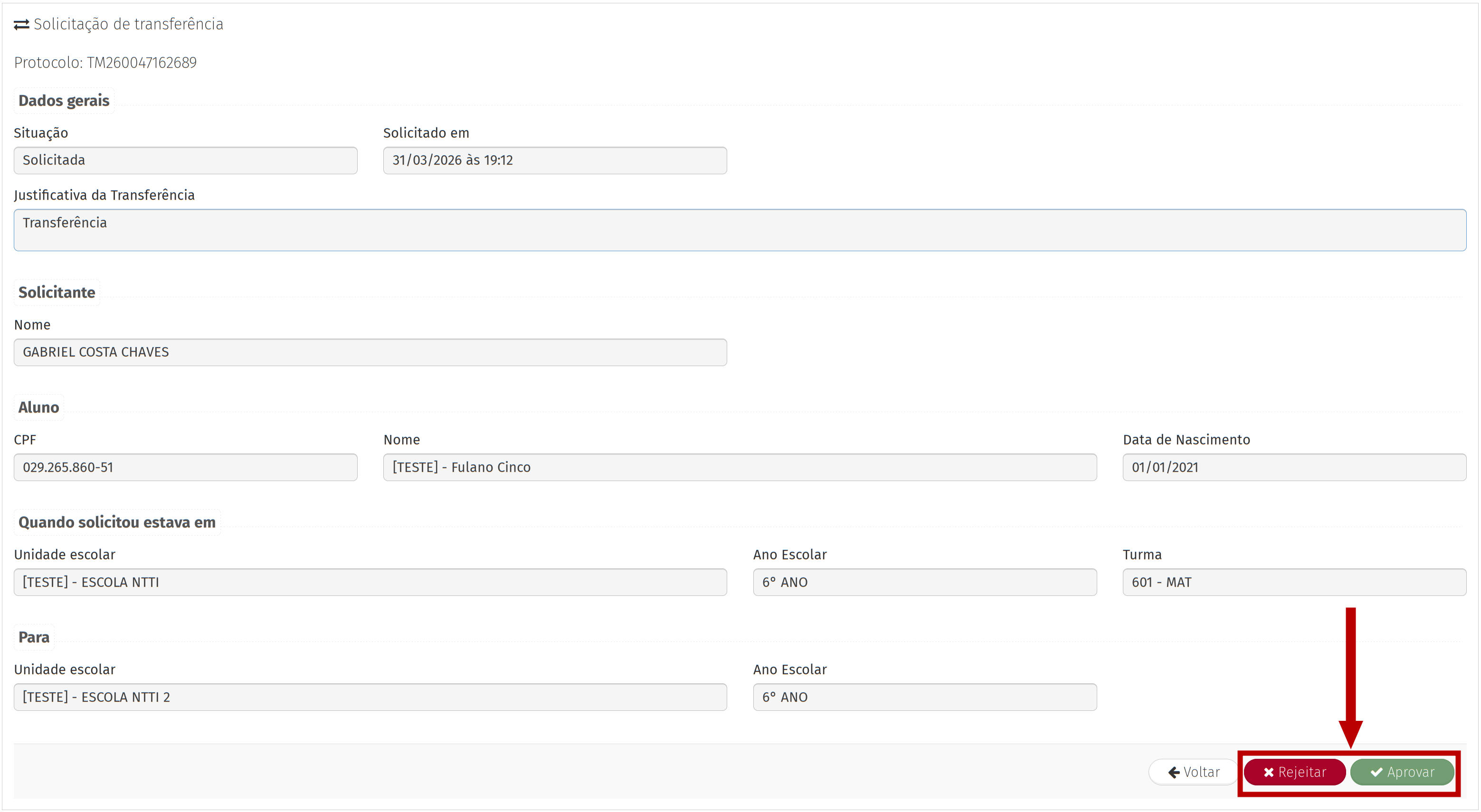 Para receber um estudante transferido internamente, verifique se a solicitação de transferência dele foi emitida à sua escola.