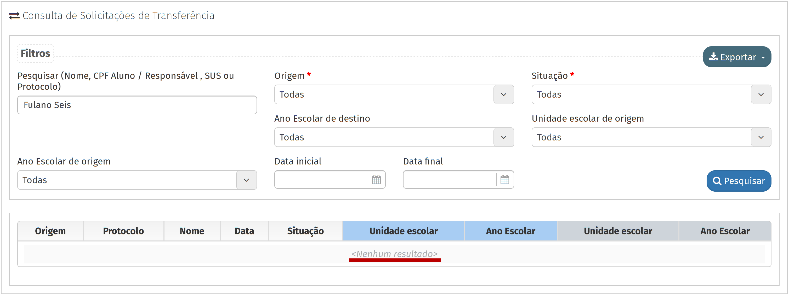 Certifique-se de que filtrou o estudante corretamente. Se não encontrar o estudante, considere que a solicitação não foi emitida à sua escola, e procure suporte.